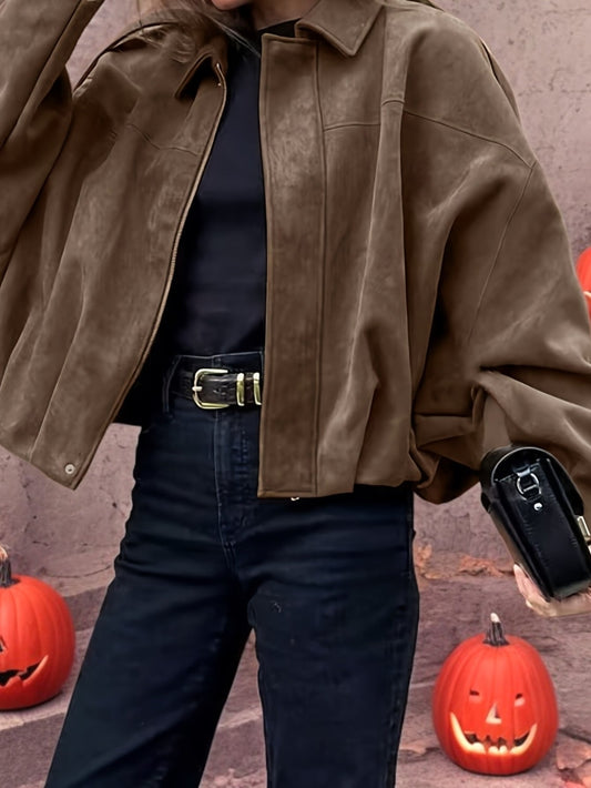 Dames Vintage Bomberjack - Losse Pasvorm Lange Mouw Rits met Drop Shoulder Design, Bruine Casual Bovenkleding voor Herfst/Winter, Non-Stretch Stof, Perfect voor Casual Kleding, Herfst Winter Jas | Vintage Bomber Stijl | Jas met Rits