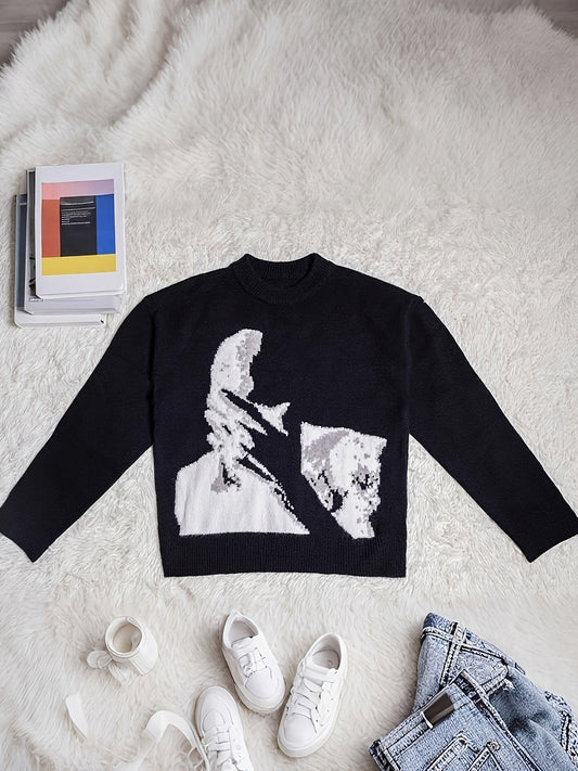 Vrouwen Halloween & Kerst Trui - Zwart-Wit Gezicht Print Pullover, Zachte Dagelijkse Trui voor Halloween Feestoutfits, Kerstcadeaus - Jaarrond Casual Chic Trui voor Vrouwen, Feestelijke Kleding, Geometrisch Patroon, Comfortabele Pasvorm, Vakantie Shoppers