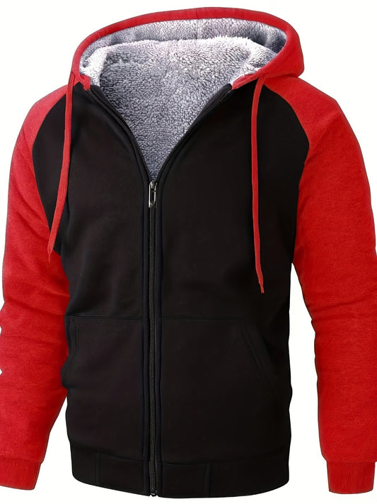 Herren Rood & Zwart Capuchonjas met Sherpa Voering - Warme Fleece-gevoerde Winterjas, Casual Lange Mouwen Pullover voor Herfst/Winter, Winterjas, Kleurblok Ontwerp, Duurzame Ritssluiting