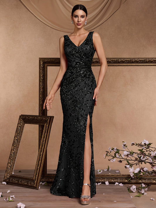 Stijlvolle Zwarte Pailletten V-Hals Jurk met Hoge Split - Mouwloos, Bodycon Zeemeermin Jurk voor Vrouwen, Perfect voor Formele Evenementen en Feesten, Formele Avondkleding | Elegante Pailletten Jurk | Strakke Nauwsluitende Ontwerp, Jurk